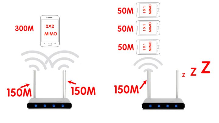 也就是說(shuō)如果你的路由器是2根天線的,就算你連接了10部1根天線的手機(jī),也同樣只能用到路由器的一根天線。